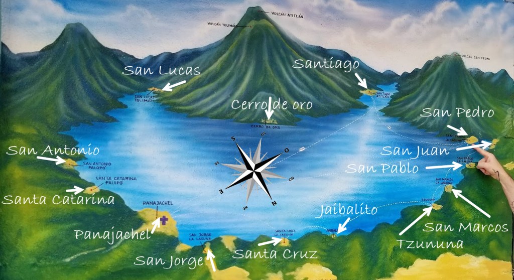 Panajachel est la ville la plus développée touristiquement. C’est la première que vous allez forcément connaître puisque presque tous les transports publics et les navettes touristiques y passent. C’est aussi à partir des embarcadères de « Pana » (comme le disent les locaux) que partent les « lanchas » (petits bateaux à moteur) vers les villages en bordure du lac. Au bout de la rue Santander, vous aurez les embarcadères pour les villages du côté est du lac et; tout au bout du côté ouest de Pana vous aurez les embarcadères pour les villes du côté du coucher du soleil.