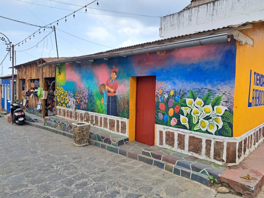 Puis San Juan la Laguna. Ce village est de loin mon préféré. Il est assurément celui qui est le plus artistique, dynamique et culturel. Les habitants de l’ethnie tzutujil sont fiers de leurs traditions artisanales : peinture et tissage notamment, et ils ont su les mettre en valeur. Sur les murs des bâtiments du village, vous pourrez observer de magnifiques fresques représentant la vie quotidienne des habitants. Vous serez ébahi par tant de beauté! Et, vous ferez des photos à profusion comme je l’ai fait.