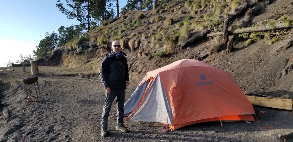 Notre camping est perché juste en dessous de la ligne des arbres avec une vue imprenable sur la vallée d’Antigua et le Volcan de Fuego. Vous vous trouvez maintenant à 3750 m.