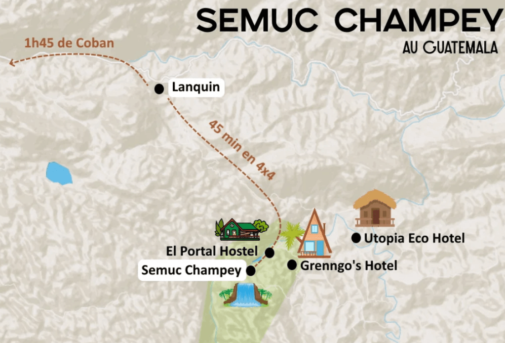 Ci-dessus, le plan de Semuc Champey et des hôtels que je recommande. Les hôtels que je vous indique possèdent tous un système de navette pour vous conduire au Parc des Semuc Champey et pour vous récupérer.
